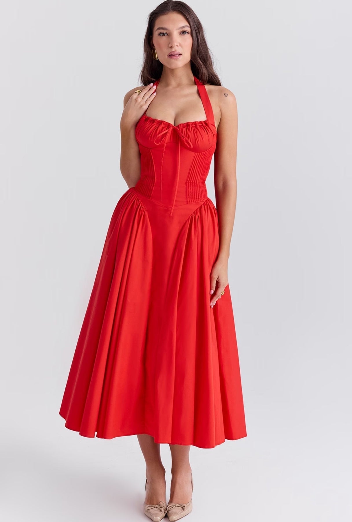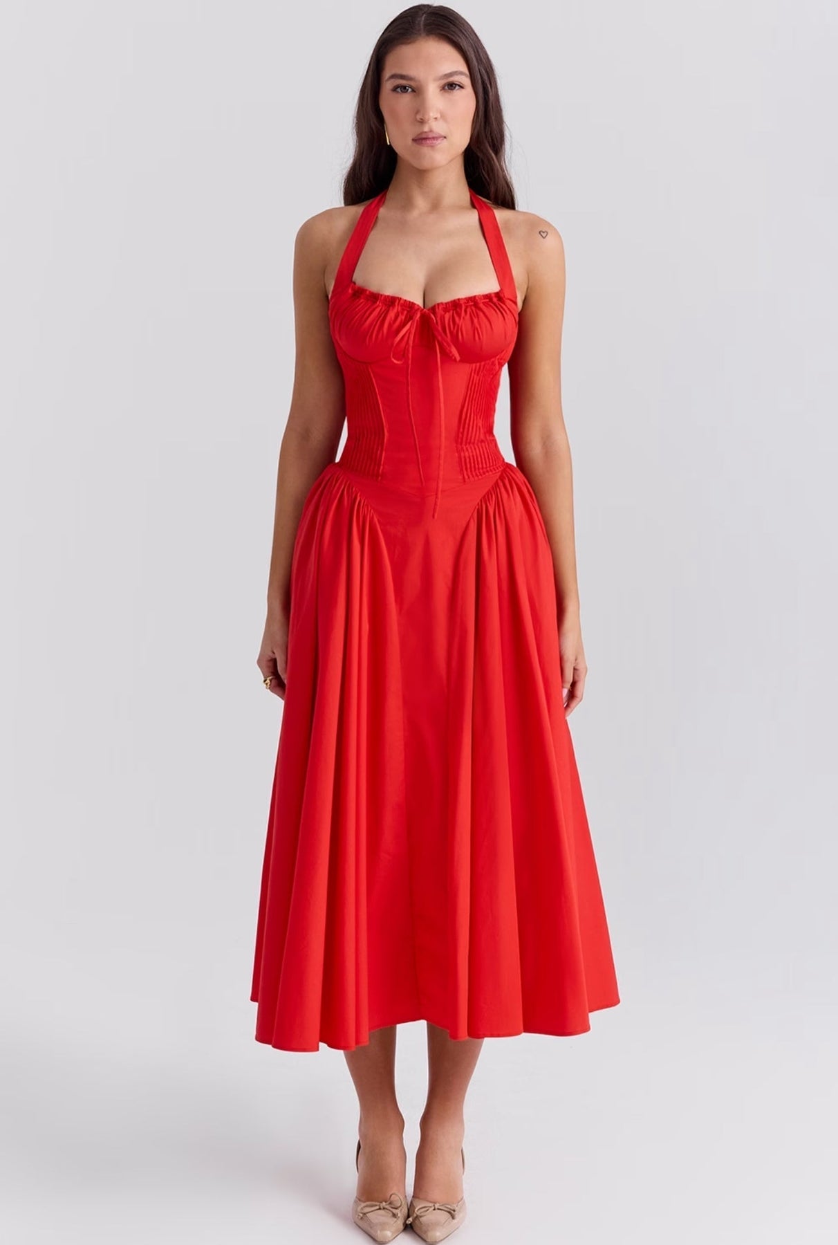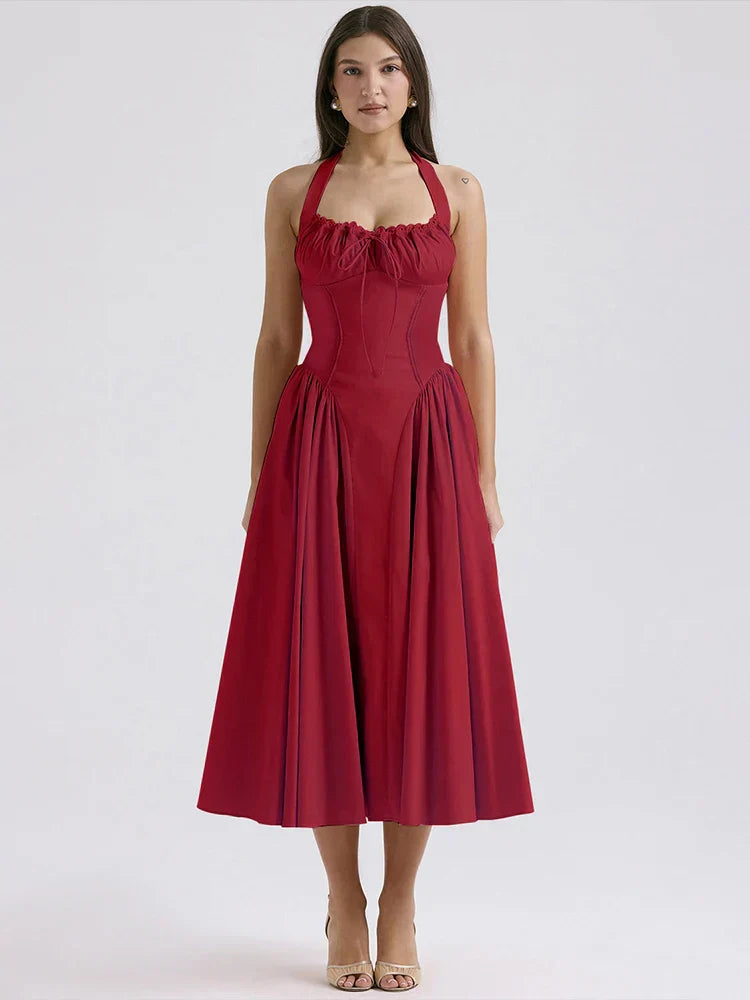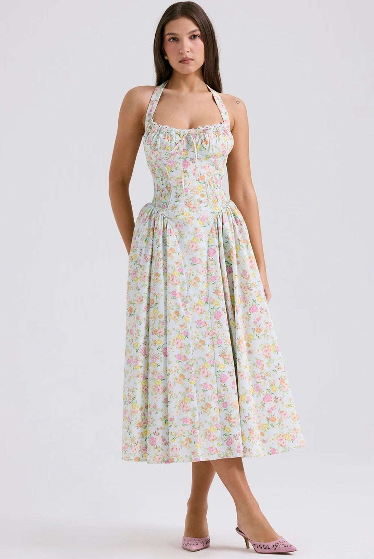 Stylizuj ją bez wysiłku na każdą okazję: zestaw ją z sandałami na obcasie i kapeluszem przeciwsłonecznym na elegancki dzienny wygląd, lub podnieś swoją stylizację szpilkami i wyrazistą biżuterią na wieczorne wyjście. Uroczy dekolt w kształcie serca i subtelne falbany dodają warstwę kobiecości, która sprawia, że ta sukienka jest prawdziwym wyróżniającym się elementem.