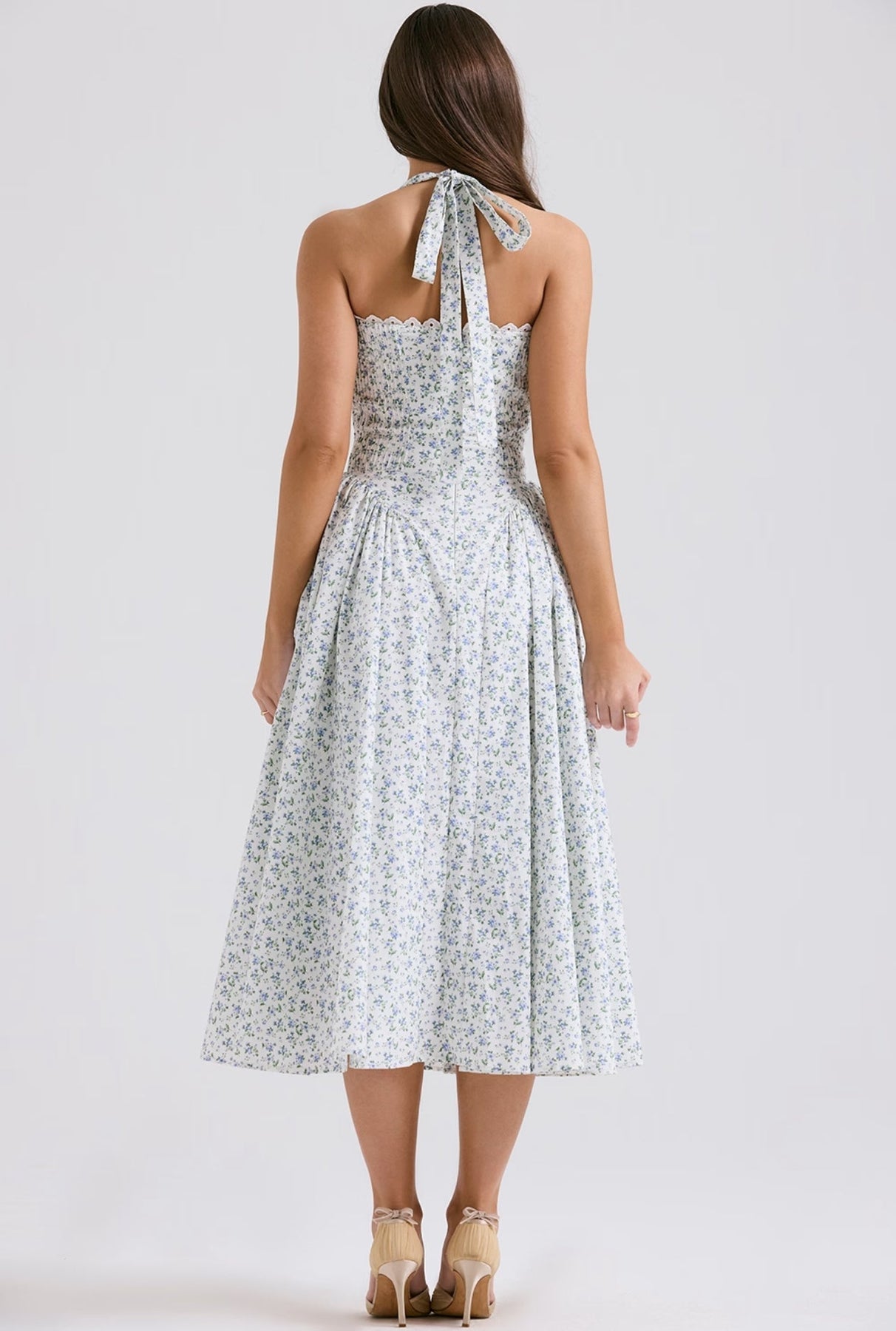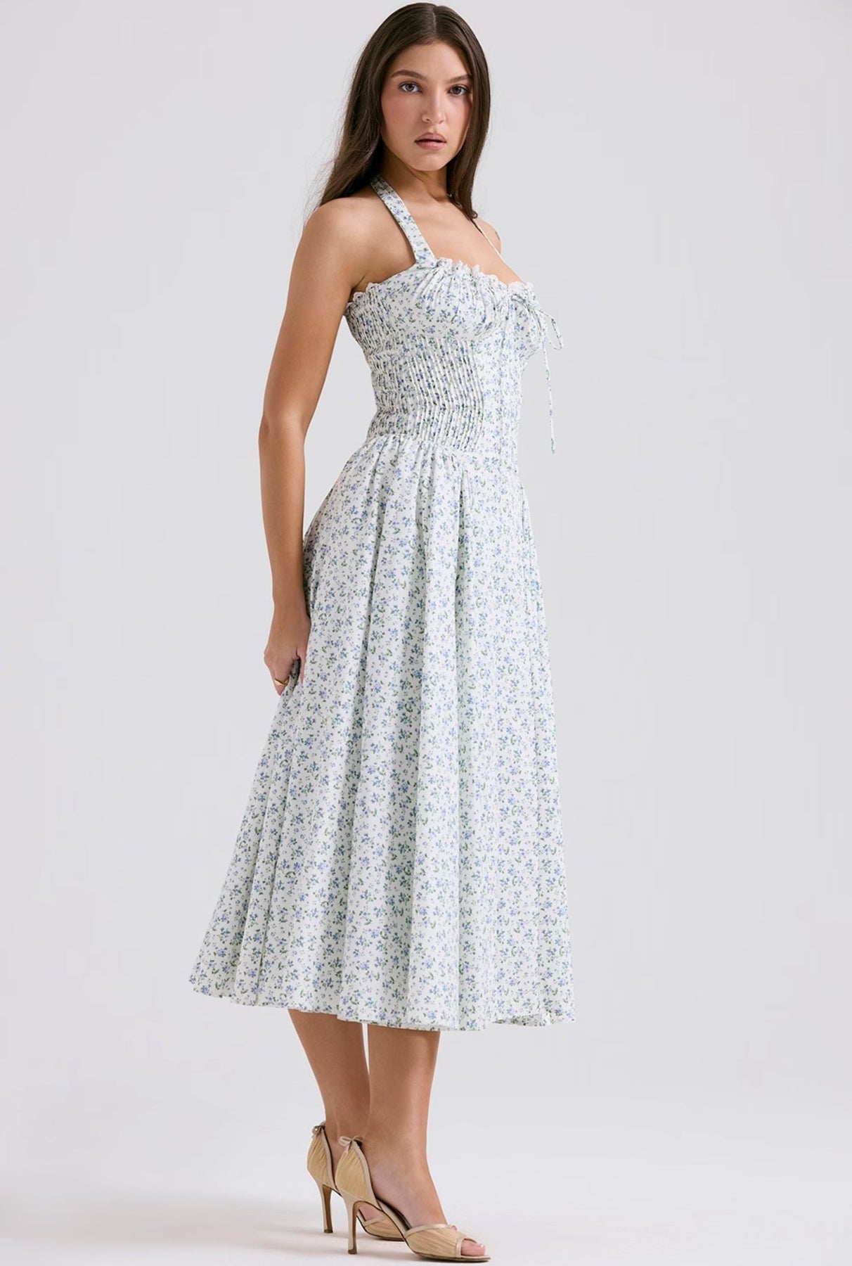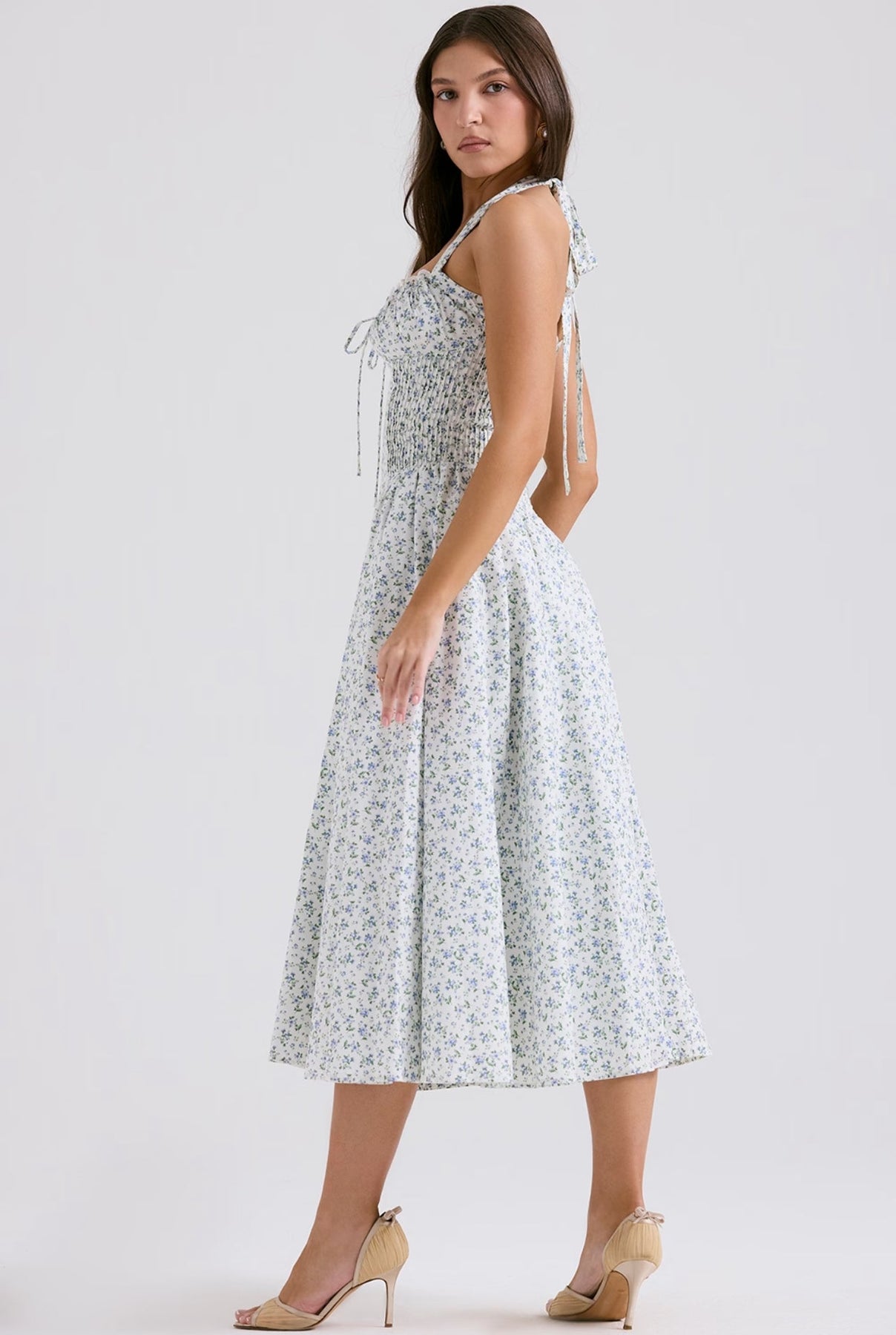 Stylizuj ją bez wysiłku na każdą okazję: zestaw ją z sandałami na obcasie i kapeluszem przeciwsłonecznym na elegancki dzienny wygląd, lub podnieś swoją stylizację szpilkami i wyrazistą biżuterią na wieczorne wyjście. Uroczy dekolt w kształcie serca i subtelne falbany dodają warstwę kobiecości, która sprawia, że ta sukienka jest prawdziwym wyróżniającym się elementem.