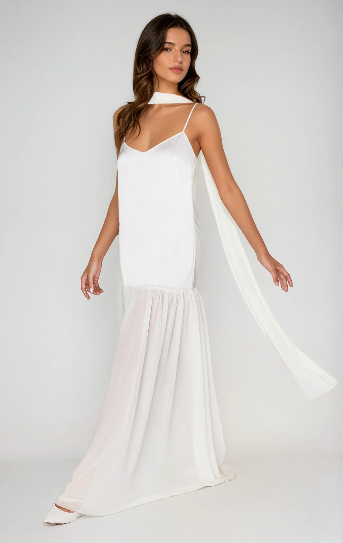 Przedstawiamy suknię 'Lavienne' — oszałamiający model zaprojektowany na wieczory przy świetle księżyca i złote godziny. Doświadcz elegancji subtelnego luksusu z każdym swobodnym ruchem.