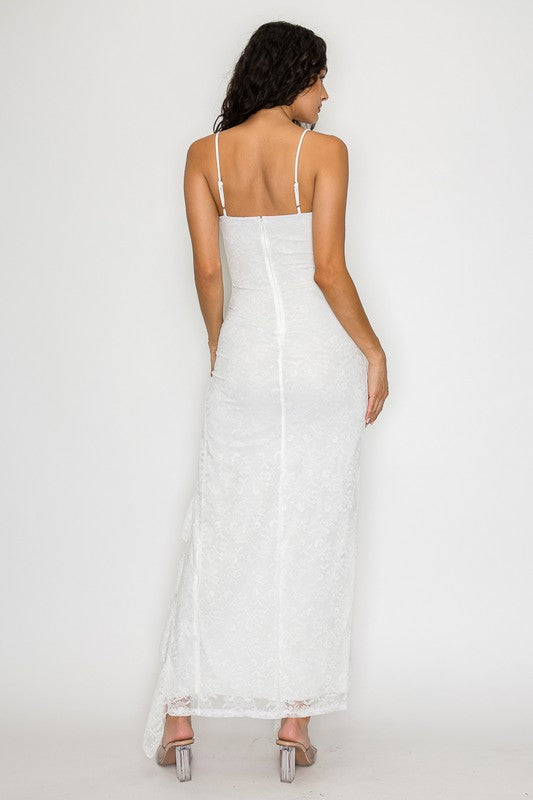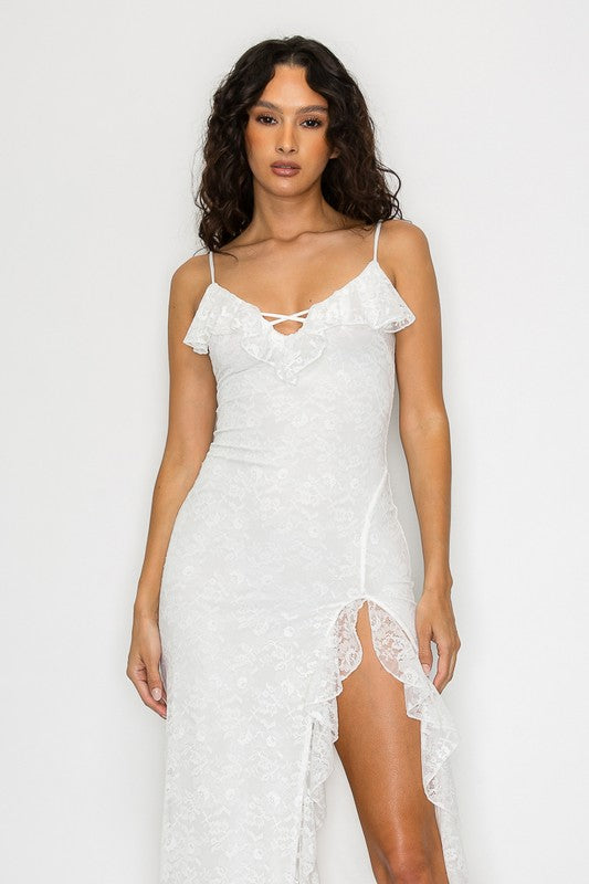 Wykonana z marzycielskiej, elastycznej koronkowej tkaniny, sukienka ‘Celestine’ otula Twoją sylwetkę eteryczną gracją. Delikatny odcień kości słoniowej podkreśla jej romantyczny klimat, podczas gdy falbaniasty dekolt i regulowane ramiączka dodają uroku. Krzyżujące się detale w okolicy biustu podnoszą urok, a rozcięcie do uda, wykończone kaskadowymi falbanami, odsłania odpowiednią ilość nogi.