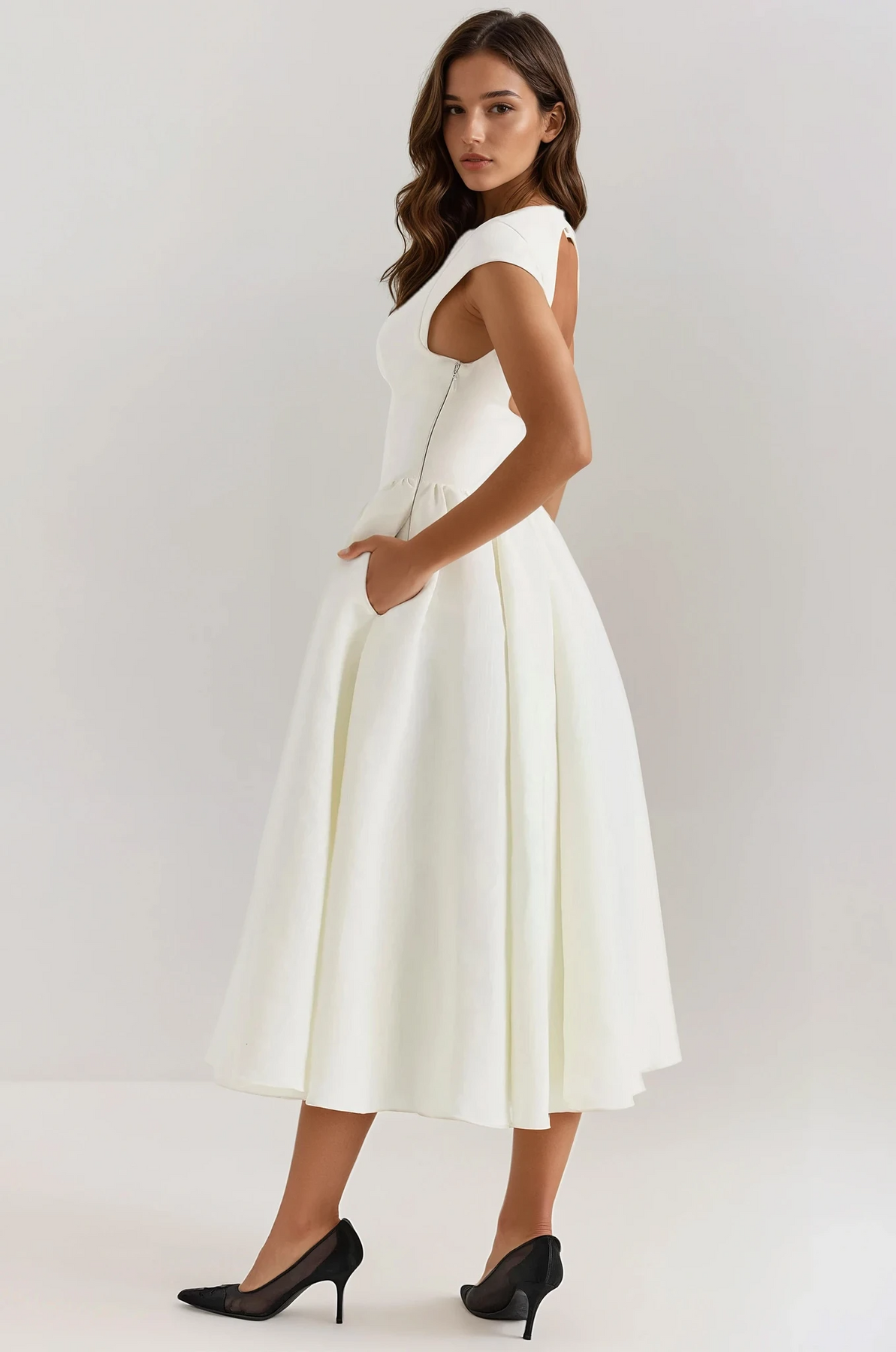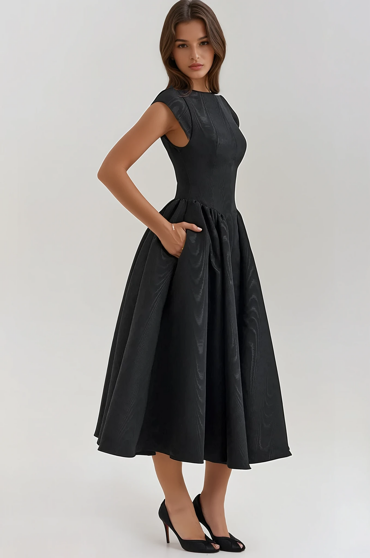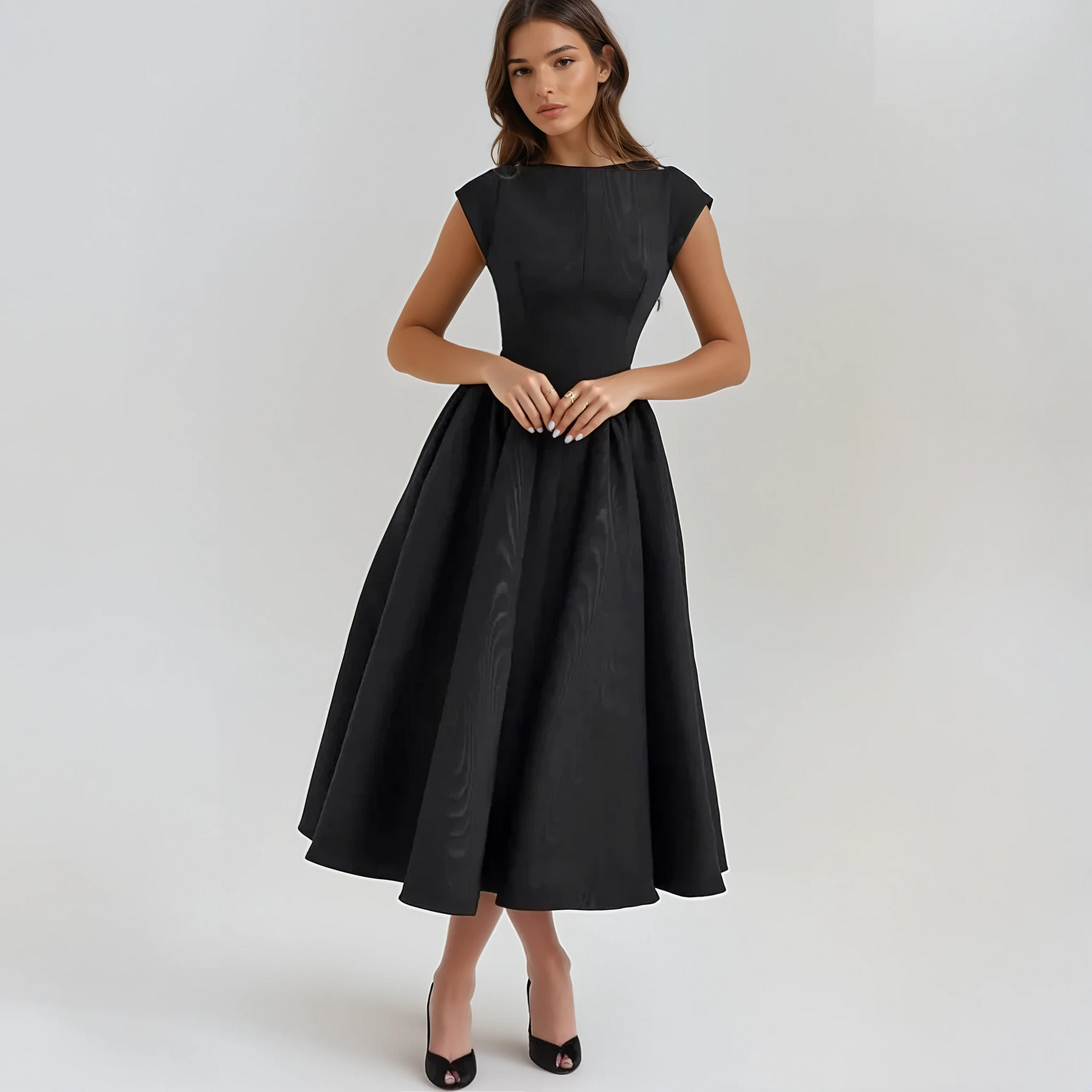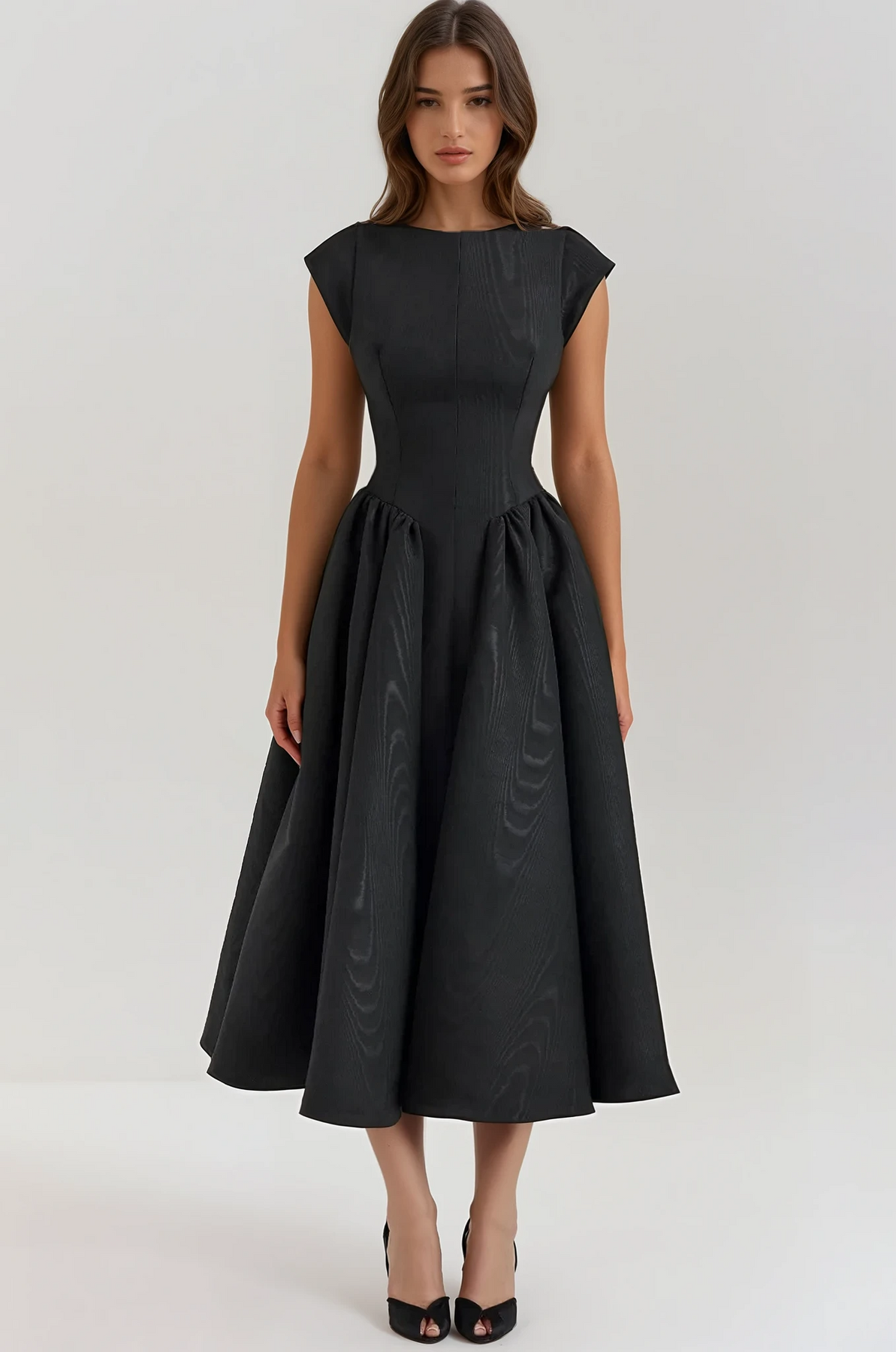 Wykonana z luksusowego satyny moiré, sukienka Evangeline ma korzystny dekolt w łódkę i eleganckie rękawy typu cap. Rzeźbiona góra podkreśla talię, przechodząc w objętość spódnicy o długości herbacianej, która emanuje znakomitą pełnią. Niespodziewany detal z odkrytymi plecami dodaje zmysłowego akcentu do tej ponadczasowej sylwetki.